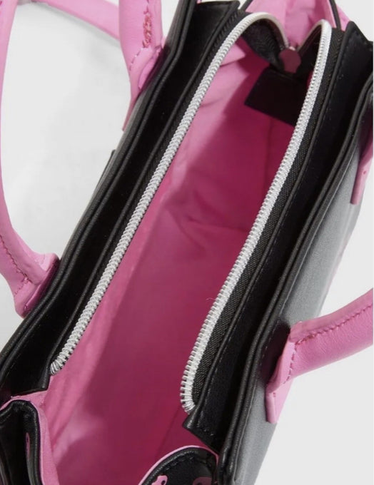 On the front, sweet My Melody playfully points a pink bunny ear down over Kuromi, who guards a front compartment while wearing a dare-devilish look and her pink-skull cap. On the back, the sweet and sassy duo makes another appearance together. Note the interior lining, which unites the pair in an adorable motif. Backpack features include adjustable straps, double pockets, gold-colored metal hardware, vegan leather (polyurethane), and applique, embroidered, and printed details.